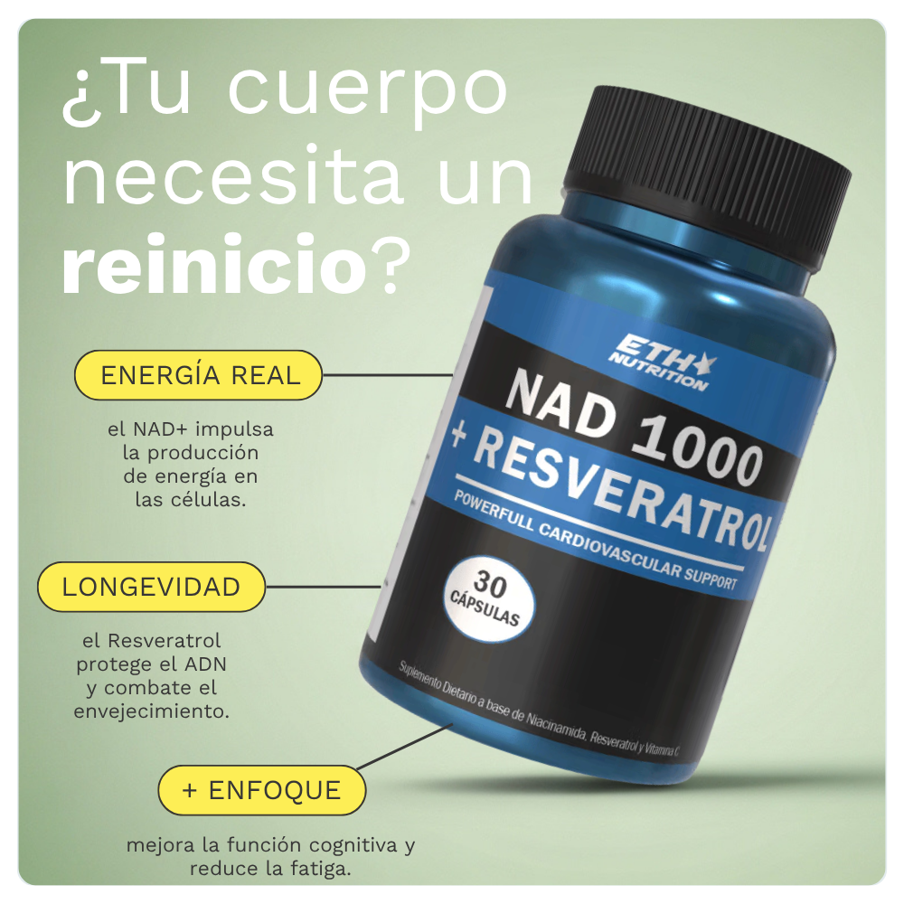 ETH NAD 1000 + Resveratrol combina dos ingredientes esenciales para la vitalidad: el NAD+ y el resveratrol. El NAD+ es una coenzima presente en todas las células, imprescindible para la producción de energía y la reparación del ADN; sus niveles disminuyen con la edad. El resveratrol es un polifenol antioxidante que neutraliza los radicales libres y se asocia a la salud cardiovascular. Esta fórmula avanzada está diseñada para rejuvenecer tus células, mejorar la energía y proteger tu organismo.
